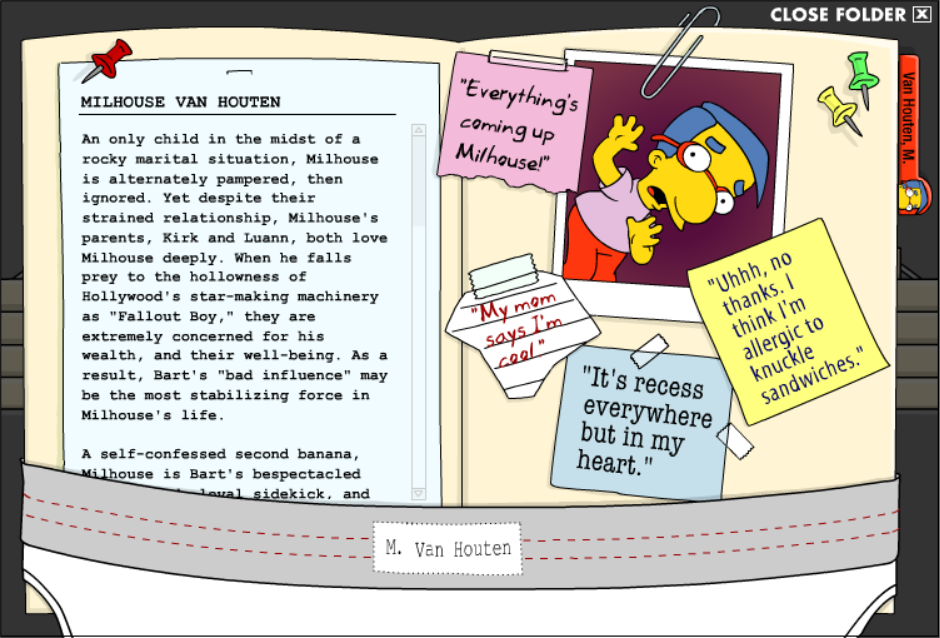 The character folder for Milhouse Van Houten located in the Hall of Records of The Simpsons website.